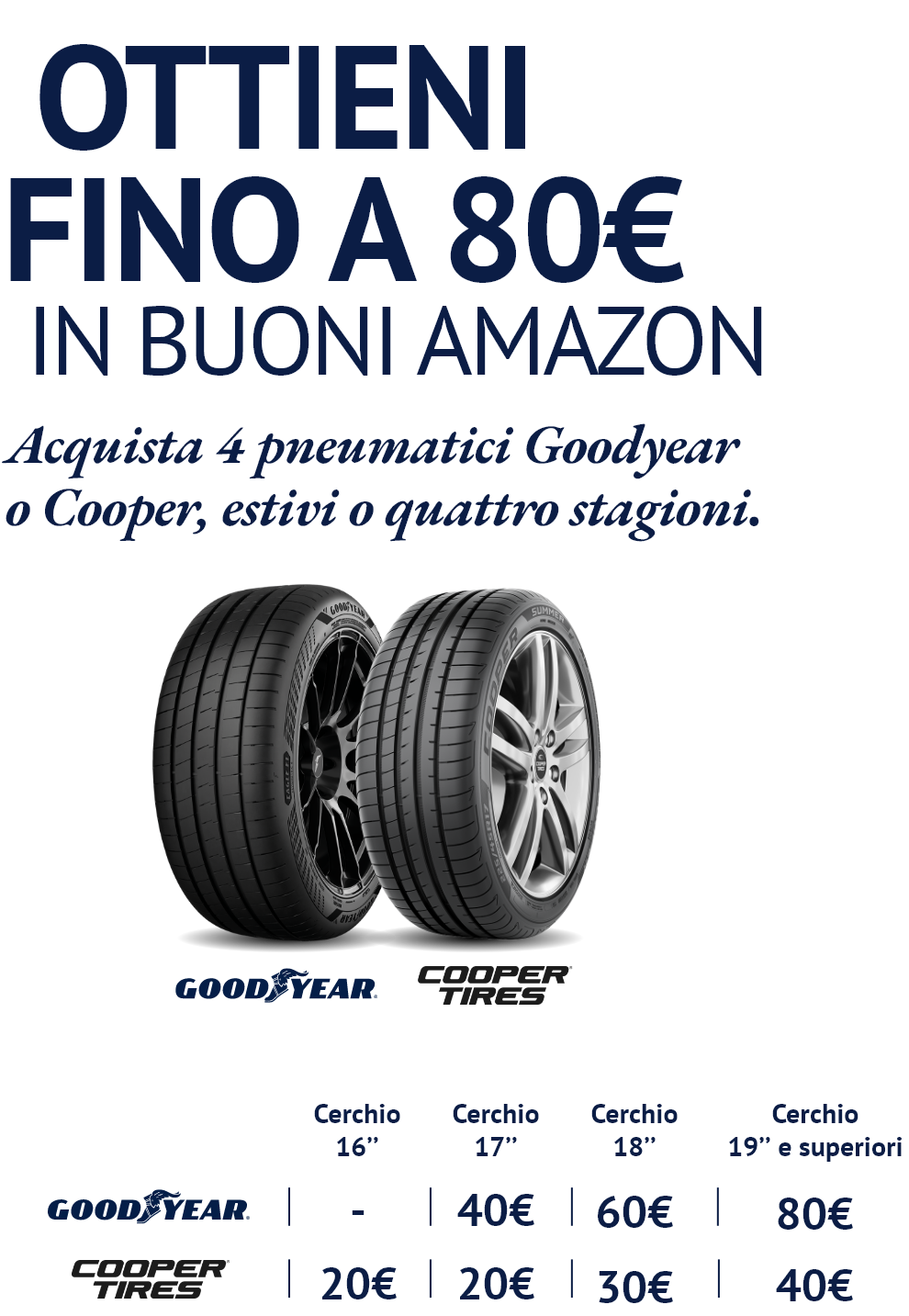 Dal 14/04 al 16/06, acquista 4 pneumatici Goodyear o Cooper, estivi o quattro stagioni a partire dal cerchio 16” e superiori. Completa il form entro il 30/06 e carica il documento di vendita (ricevuta fiscale o scontrino “parlante”).